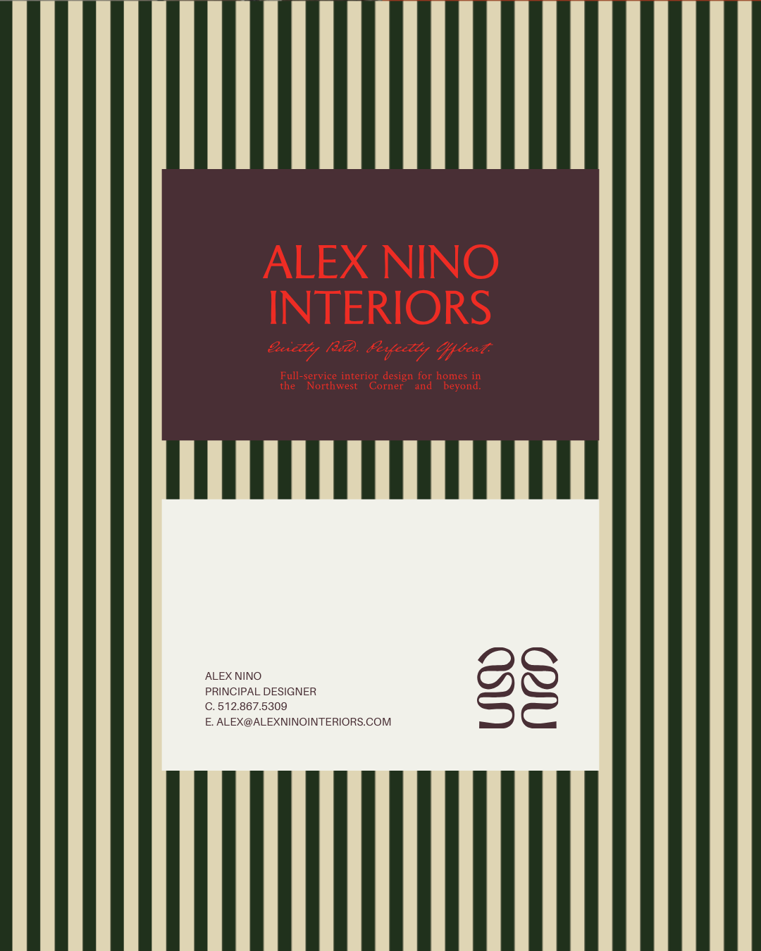 With a design perspective that embraces contrast, personality, and quiet confidence, Alex Nino Interiors needed a brand that felt both intentional and unexpected. We developed a rich, moody color palette grounded in deep plum and warm cream, layered with bold accent tones that nod to classic design while pushing it slightly off-center. Refined serif typography is balanced with playful, handwritten details, creating a visual language that feels elevated yet human. Subtle graphic elements and pattern work add rhythm and movement throughout the brand, reinforcing a sense of individuality and creative edge. The result is a brand identity that feels quietly bold, perfectly offbeat, and unmistakably Alex Nino.