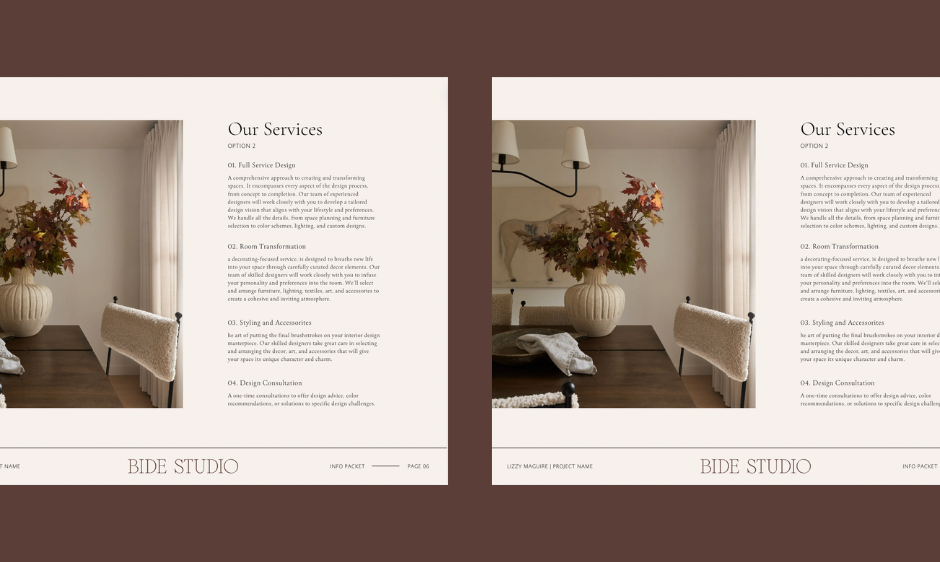 Sarah Killam approached me for a rebrand and website overhaul to better encapsulate Bide Studio's unique approach to interior design. Focused on blending modern elegance with functional beauty, the new brand identity aims to highlight their use of high-quality, natural materials and a commitment to creating spaces that are not only aesthetically pleasing but deeply personal and inviting. The goal was to craft a visual narrative that resonates with Sarah’s dedication to designing restorative and welcoming environments.